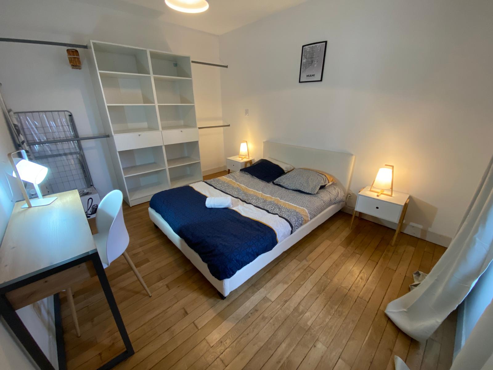 🛏️ Depuis le salon, accès à la chambre lumineuse avec dressing et coin bureau 💻.