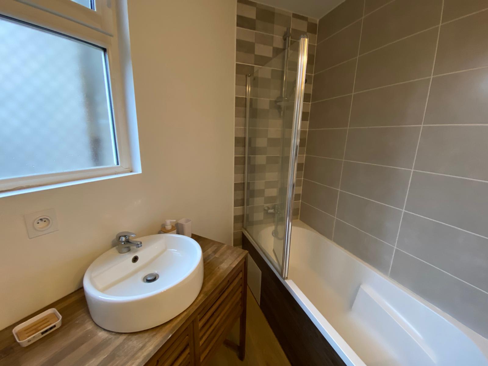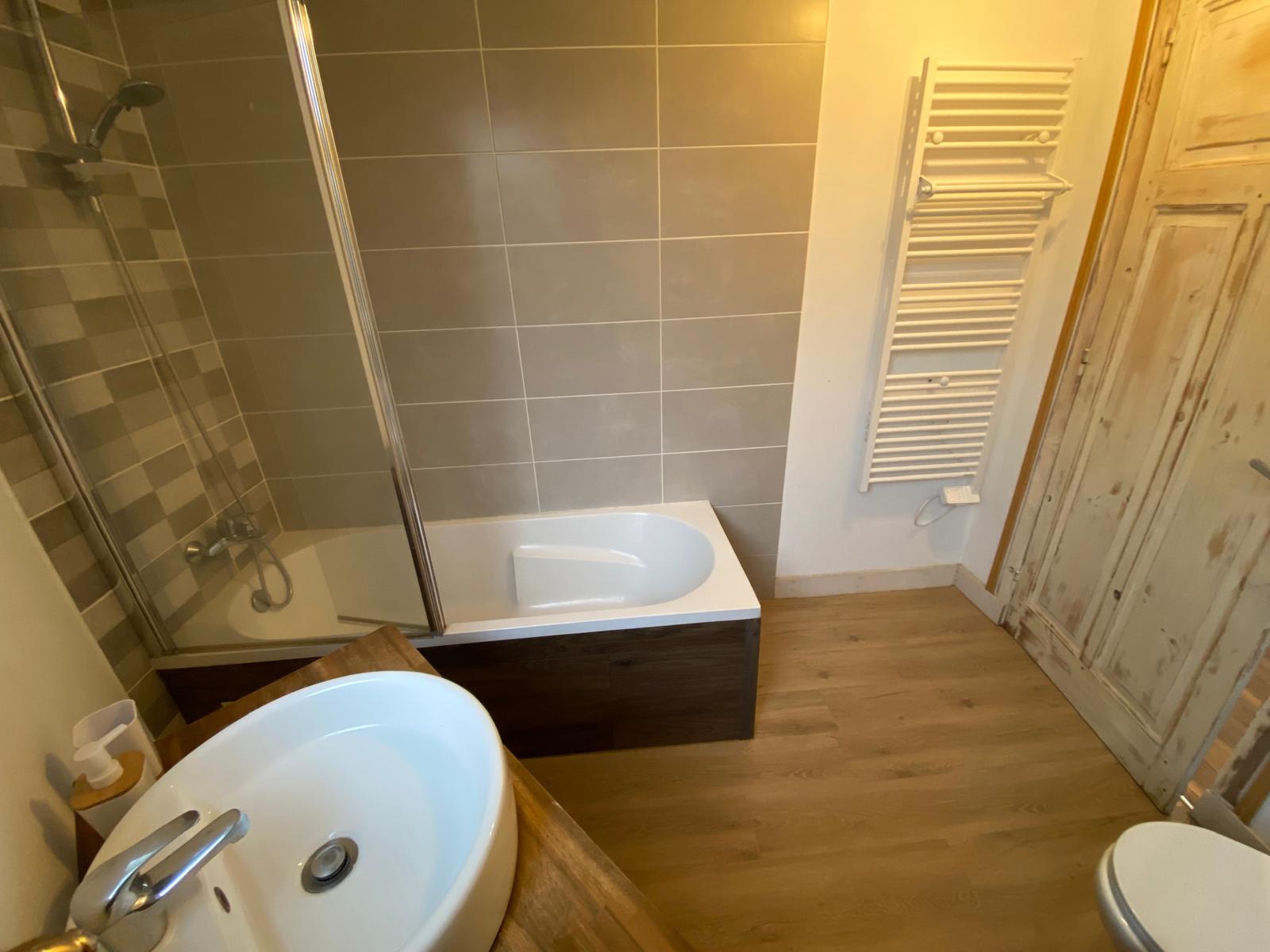 🛁 À gauche, la salle de bain avec baignoire, WC et machine à laver 🧺.